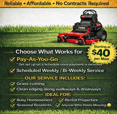 Our lawn services are perfect for homeowners who want simple, reliable lawn maintenance with flexible scheduling and pay-as-you-go options.